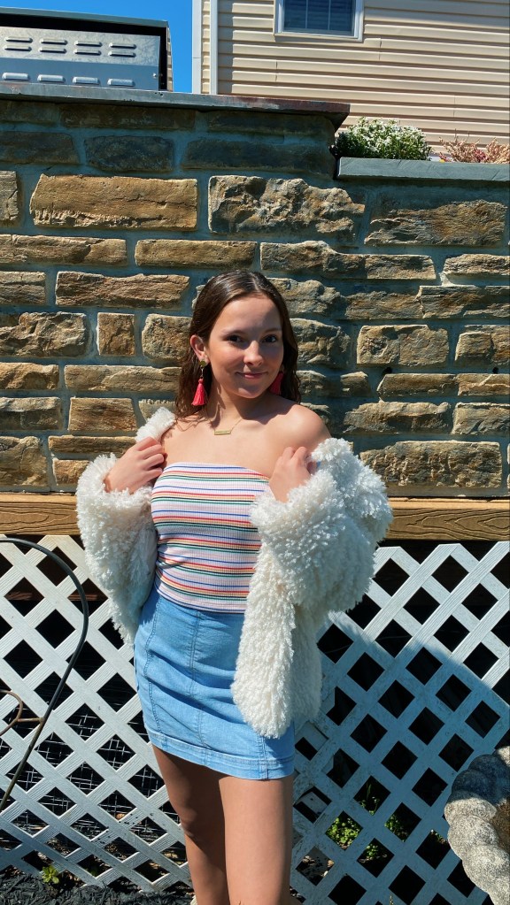 For the second look I got a little more fancy and added a fluffy white coat from TJ Maxx. I wore this adorable striped tube top form American Eagle that I’ve had for a few years but I wanted to prove that tube tops can still be trendy as long as you style it correctly. I spiced up the look by adding hot pink tassel earrings from Shein to match with the pink stripes on the tube top. I loved the way this looks and it adds a lot of volume to the outfit. This can be worn for a more fancy dinner or if you are dressing up to hang out with you friends.