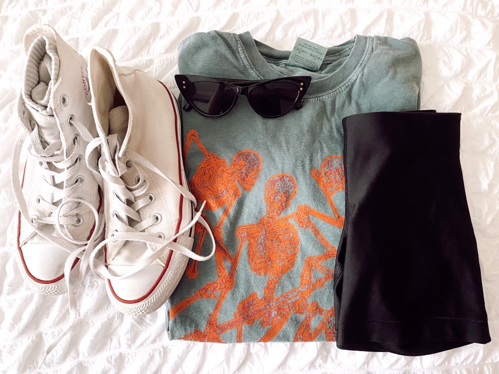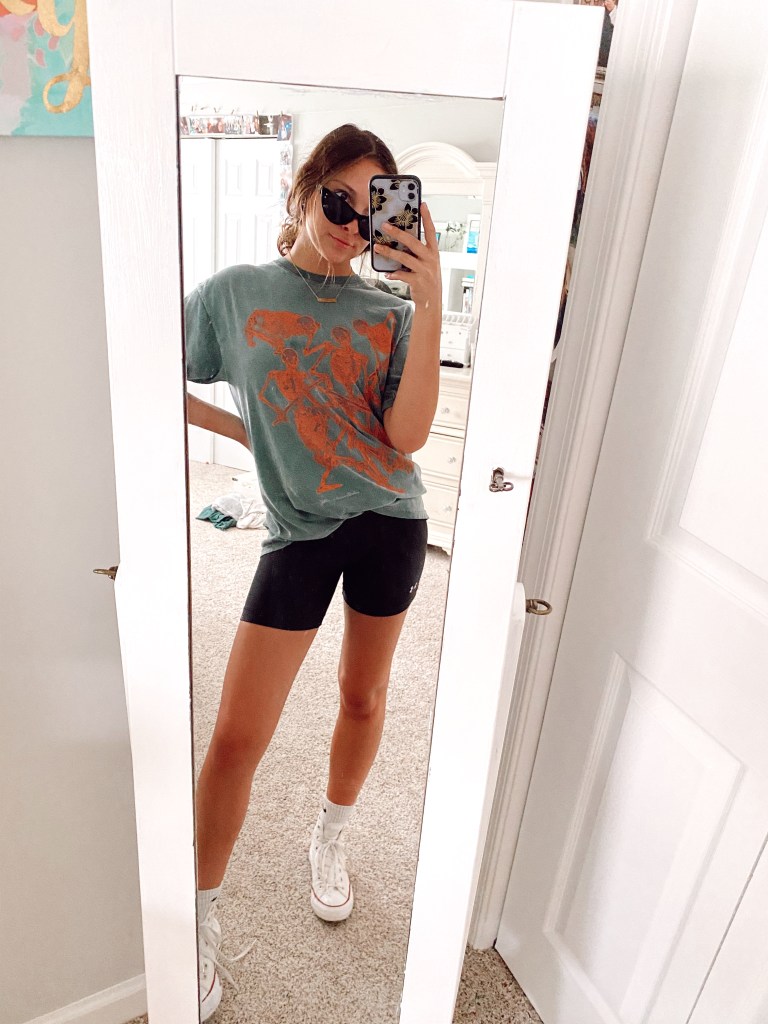 For this combo, I paired an oversized tee with biker shorts. I am totally obsessed with this combo and for sure with be wearing this more in these warmer temperatures. For shoes, I paired some classic white high top converse and nike socks. Also, I definitely had to add my favorite sunnies because they went so well with this look. If you are looking for an outfit that’s more on the trendy side or you’re going on a walk around the neighborhood and want to impress everyone with your impressive style, I recommend going with this look.