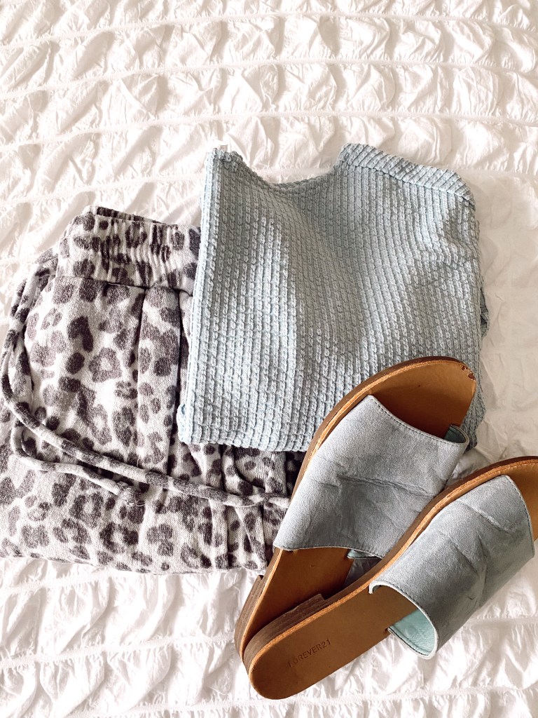 This piece is definitely more on the more stylish side but still super comfy! These TJ.Maxx grey cheetah joggers were one of my favorite purchases. I seriously wear them all the time and I love pairing them with basic colored shirts that make one adorable quarantine outfit. I had the perfect Forever 21 flats to pair with this look. I love this outfit because it is SO cozy but still shows that you put some effort in.