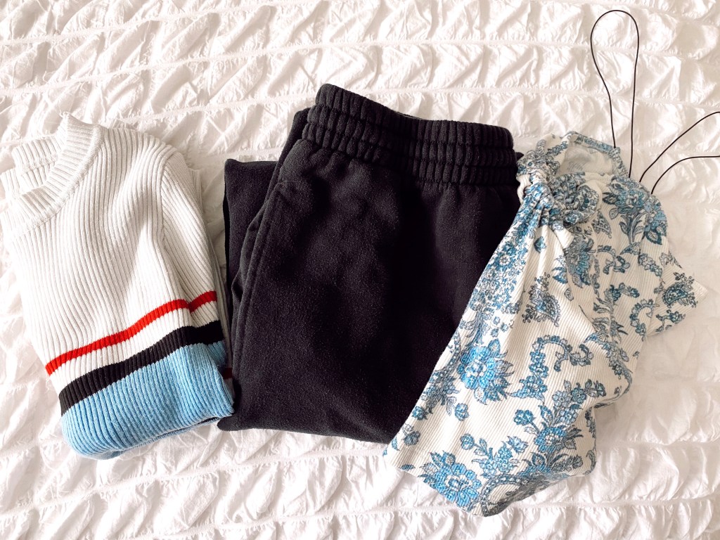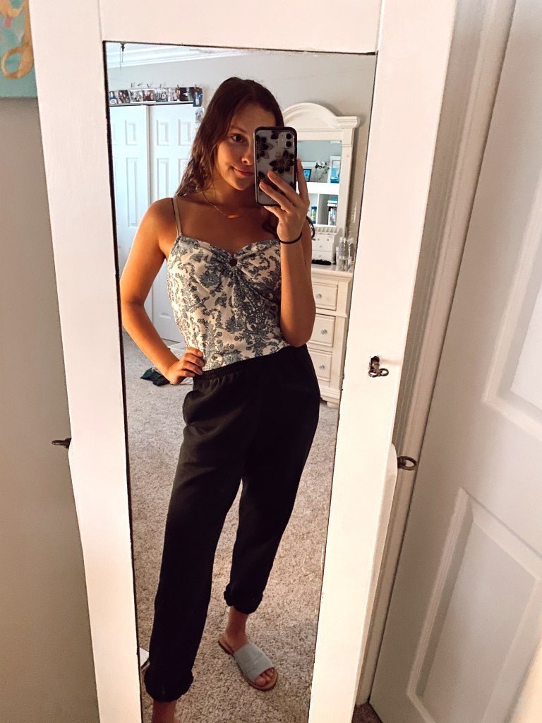 Lastly, the most laid back of the three looks. My favorite go to sweatpants have seen MANY days in the last two months. I figured I should put them to good use and pair them with a cute top. So, depending on the weather, I pair the sweats with a stylish tank or cozy long sleeve. This is probably the outfit you will see me wearing most often in quarantine since it’s so customizable and interchangeable. You can always spice up these basic outfits with accessories, shoes, and hairstyles to make it your own. The black sweats are from Walmart, the blue tank is from American Eagle, and the long sleeve is from a local Goodwill.