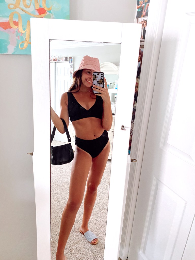 This is one of the plainer suits but it is probably one of my favs! Especially since it’s super flattering for an A-cup like I am, the bottoms have a lot of coverage (family-friendly), and one of those Shein suits I would actually say is perfect for swimming. This suit may be bland at first glance, but since it’s black you can pair it with so many cute accessories. For me, I ordered this pink bucket hat and minimalistic shoulder bag off Shein as well and I loved how cute it paired with the swimsuit.