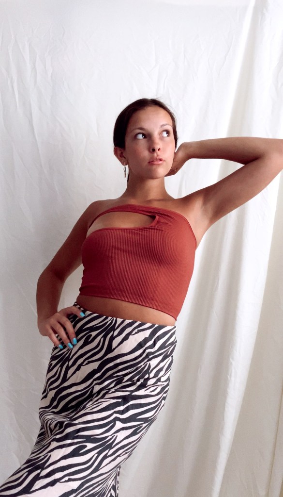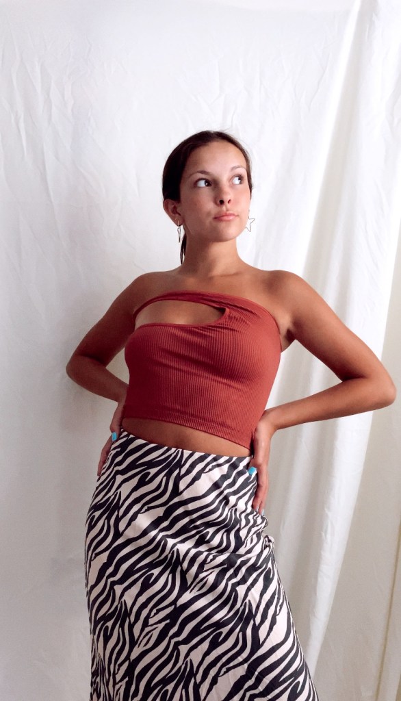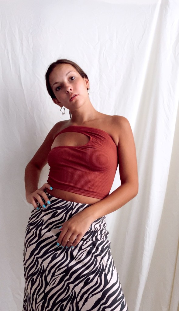 Okay bare with me here because this was a long shot, I really had no idea how this last look would turn out. I’ve seen tops shaped like this before but I seriously can’t remember what they’re called so I gave it my own name, lol. It reminds me of a Z or S shape so that’s my logic behind it but anyways, I’m not really sure how much I like it. The altercation of the top had a good idea behind it but I’m not sure how well I actually executed it. This look gave me “Vogue” vibes especially with my zebra midi skirt.