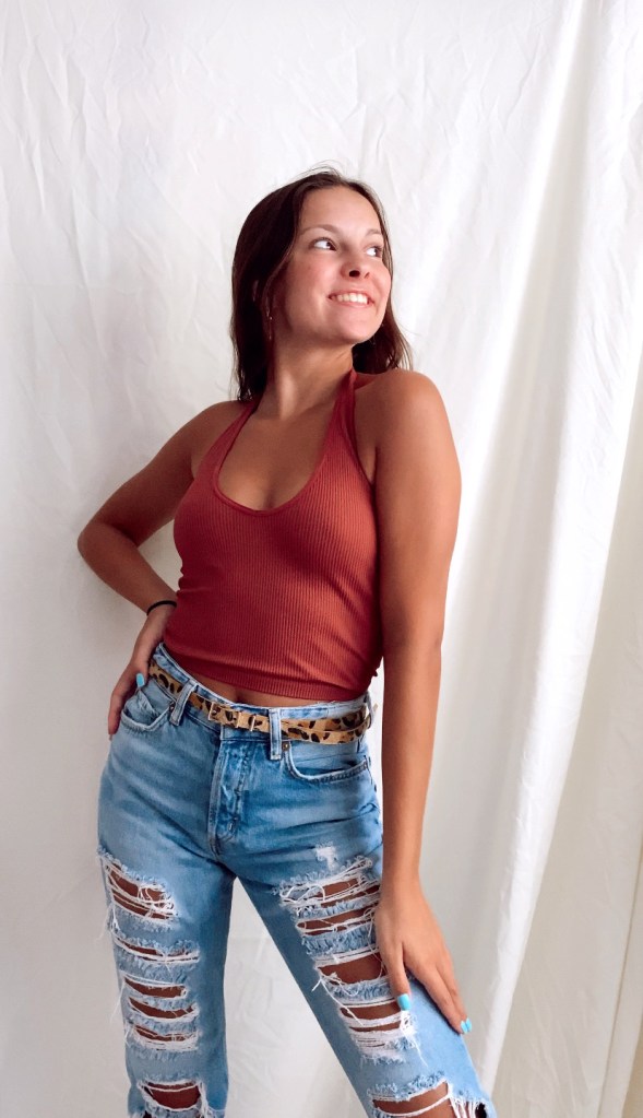 We all know and love the classic and most obvious way to style the almighty halter top. Since the halter tops are tight, I added loose ripped mom jeans to give the outfit more volume and to spice it up I topped it off with a cheetah belt. However, I want to introduce you to the other ways you can use the same top to make a completely different look.