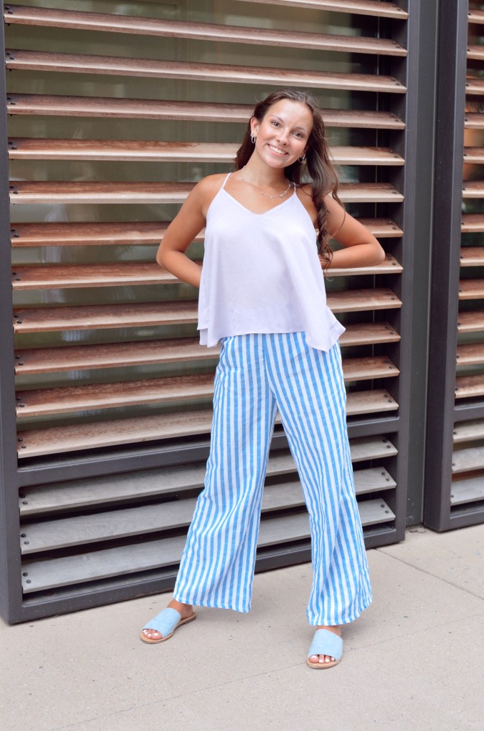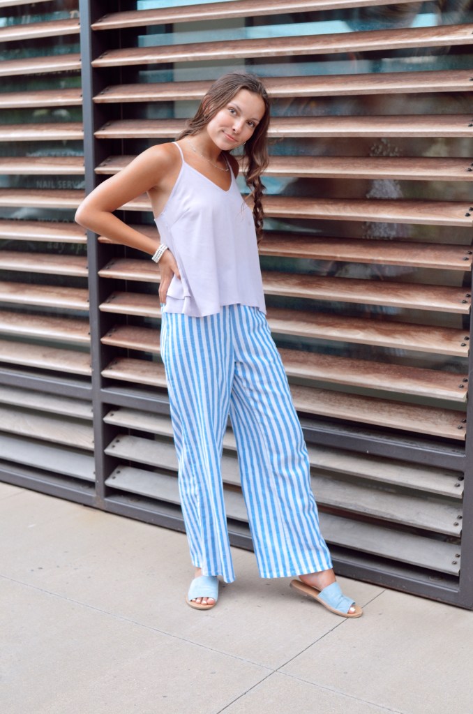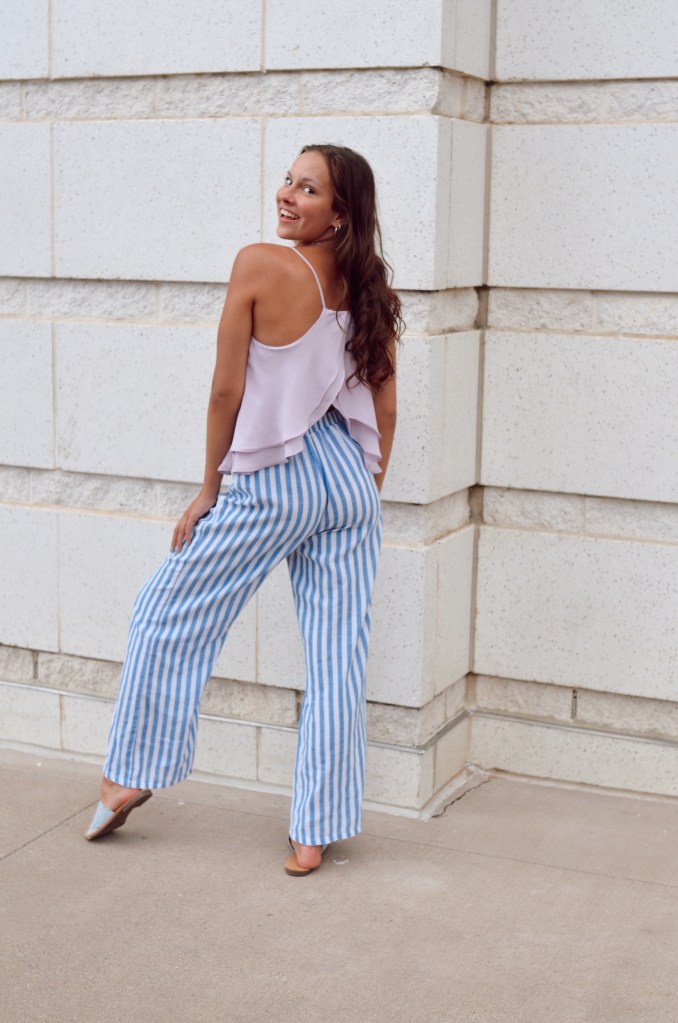 These light, pastel colors ended up looking pretty good together. I was a little nervous because these two colors are so close on the color wheel. However, since the colors were so light they weren’t too overwhelming. I also normally pair loose pants with a tight shirt but the lavender flowy tank really surprised me. This look is definitely a beachy outfit which I love.