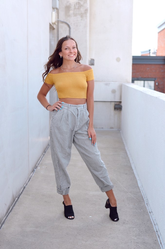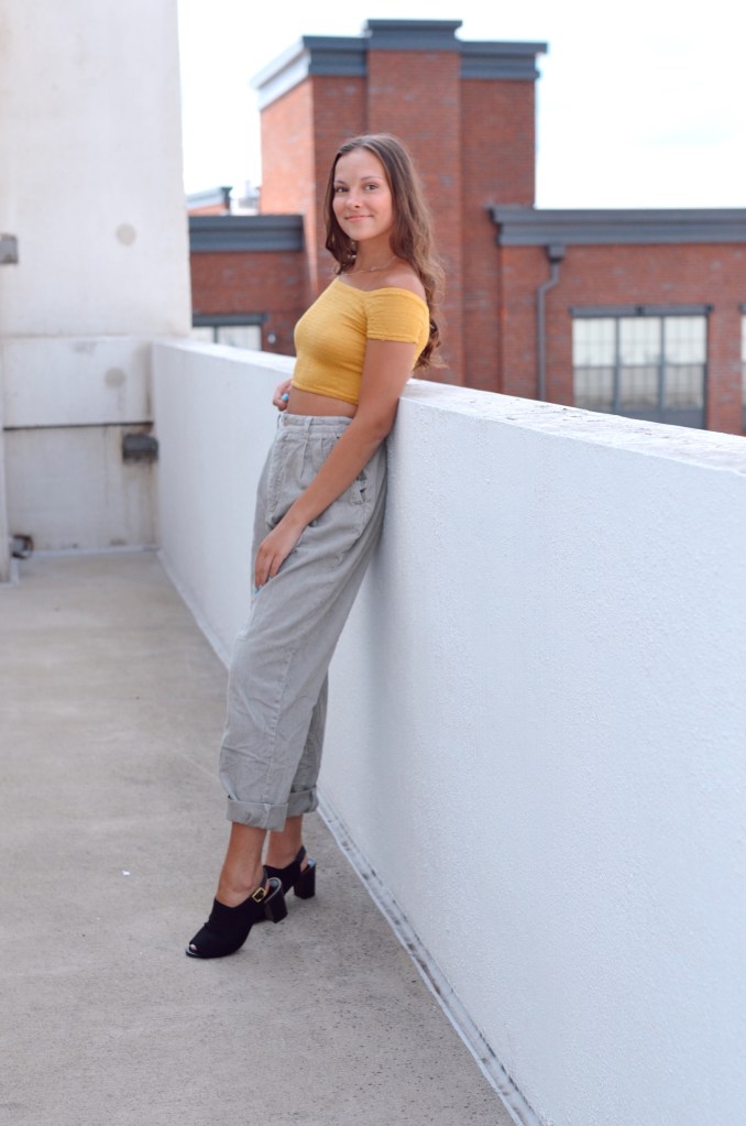 This was a combo I was pleasantly surprised with. These green pants look more on the grey side on camera but they are a very dusty olive green off camera. I really liked the way the yellow crop top looked with it as well. It captured the baggy pants, tight crop look that I normally go for. I got the pants from the thrift store and usually I pair them with an edgy look. However when I added black heels instead of white chunky sneaks, I ended up being a fan of dressing this look up. Overall, I can say I’ll be pairing these colors more often now that I’ve seen what it can turn out to be.