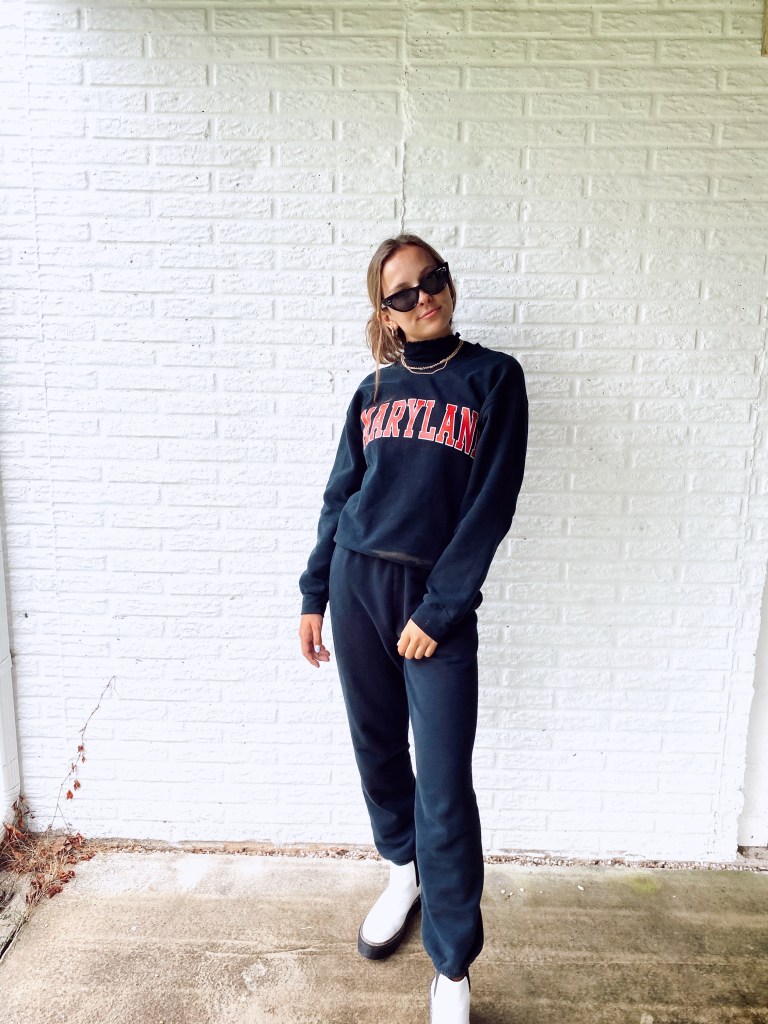 This is probably the type of outfit I would see on Pinterest and say “wow I wish I could make sweatpants look that cool”. Well, today I tried it out and it honestly was really simple. I took a basic pair of black sweats and a crewneck as the base for the outfit. To take it to the next level, I added a black turtle neck underneath the crewneck just to add some volume and of course, the accessories completed the outfit. A gold chain necklace and cat-eye sunglasses are the KEY to making my outfits look chic! This look is clearly made for chillier weather but even if you’re inside all day due to online classes, I always say that a good outfit can make a good day.
