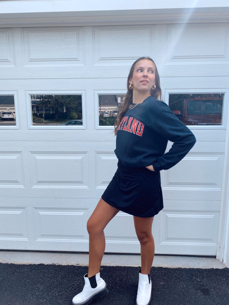Starting off strong with the classic, a sweatshirt! I’ve seen TONS of girls wearing tennis skirts with a sweater/sweatshirt or even adding a collared shirt underneath all over my Pinterest. It is super simple yet makes such a statement, especially when you add matching jewelry. It is a very basic and simple look perfect for a comfy fall outfit for online school. Throwing on a lightweight sweatshirt is also great for when the temperature drops.