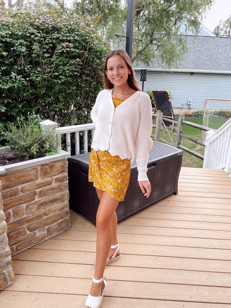 I felt very school teacher in this look but I was honestly obsessed. With the unpredictable weather in Maryland, somedays it’s the perfect fall temperature, but other days it’s back to 75 and sunny! So, to compromise I’m wearing a summery dress with a light sweater overtop.