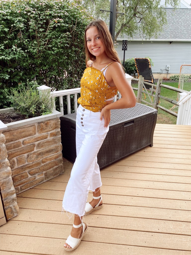 For the next look, I added white denim to match with the flowers in the dress. I was a little worried that the material would bunch up in my jeans but it really wasn’t noticeable. So, if you’re running out of tanks, tucking in a lightweight dress works just the same lol! I know this look is very summery, but adding something like a cardigan or fall booties can change the whole look from summer to fall!