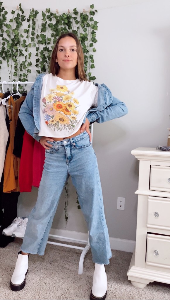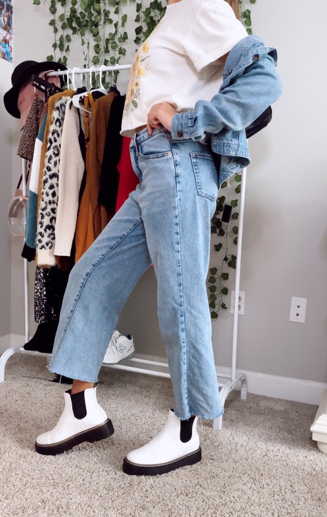 I’m honestly obsessed with this outfit, although it screams spring…I will definitely be wearing this in the fall. If you want to recreate this look, all you have to do is grab a few articles of clothing you probably have in your closet, a pair of denim jeans, any graphic tee, a denim jacket, and of course a pair of chunky booties.