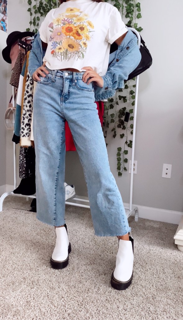 Denim clothing is one my favorite things to style with and although I wasn’t sure these wide-leg style pant would work with the boots, they did! When paired with a graphic tee and matching denim jacket, the look was completed. I like how put together and thought out the outfit presents but also how laid back it looks.