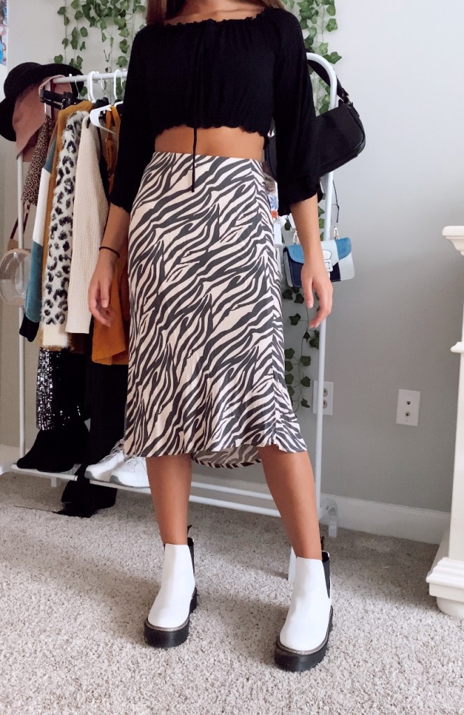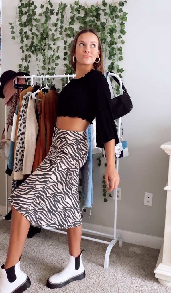 The final outfit consists of a zebra midi skirt and a black cropped long sleeve top. I’m not really sure why I picked these two pieces and thought they would go well with Docs but…they did! I think skirts and Docs are another great duo when styling outfits and I really liked how the look came together.
