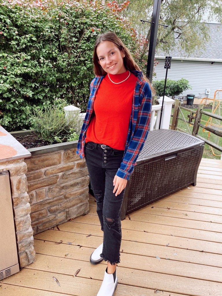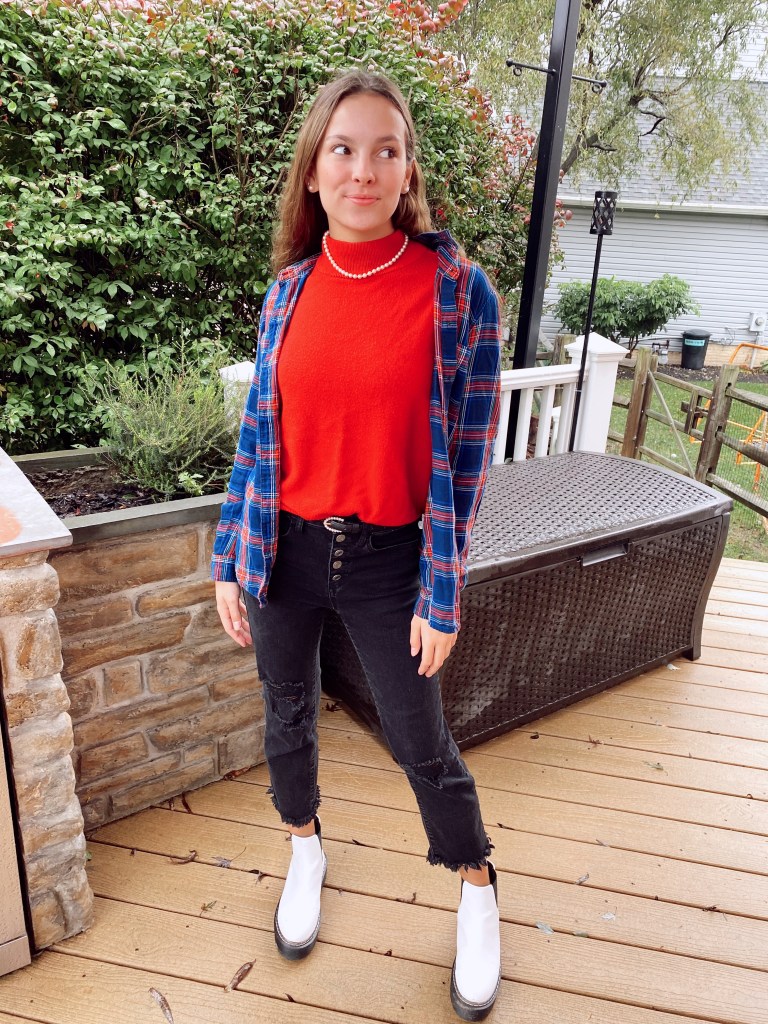 This last look is what I’m going to call the “dressy flannel look” even though all it really consists of is a pair of black jeans, a sweater, and another flannel. 3 things you again, probably have at home already! I really liked how the red sweater brought out the red detailing in the flannel and overall I think the colors of this outfit matched very well together. I accessorized with a pearl necklace and belt with my fake Docs as my choice of footwear. This look is the one I go for if I’m doing something that requires a little bit more effort than usual, but I still want to rock a trendy fall flannel!