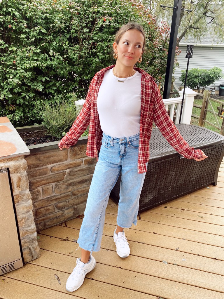 The first outfit I styled was a pretty simple look, wide-pant jeans, a basic white tee, and a red flannel. Some may see this look as “too basic” but I think it’s the right amount of basic and fashionable. I accessorized with layering gold necklaces and some gold hoops. Of course, I had to add my favorite shoes ever, the white chunky New Balance sneaks, but I loved how the blue in the shoes matched with my denim. Overall, I think this look is a great way to break out the flannels you’ve kept in the back of your closet. Everyone can pull it off because it’s a very safe look, and although it may look plain, this gives you lots of room to make the outfit personalized to your style with accessories & shoes.