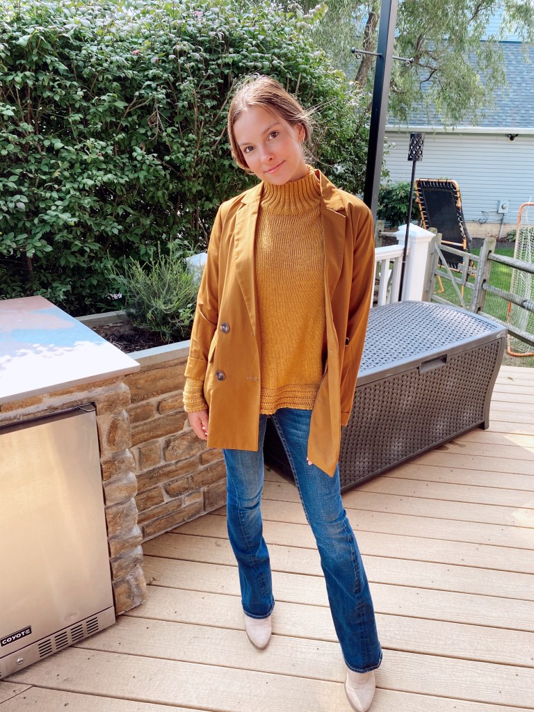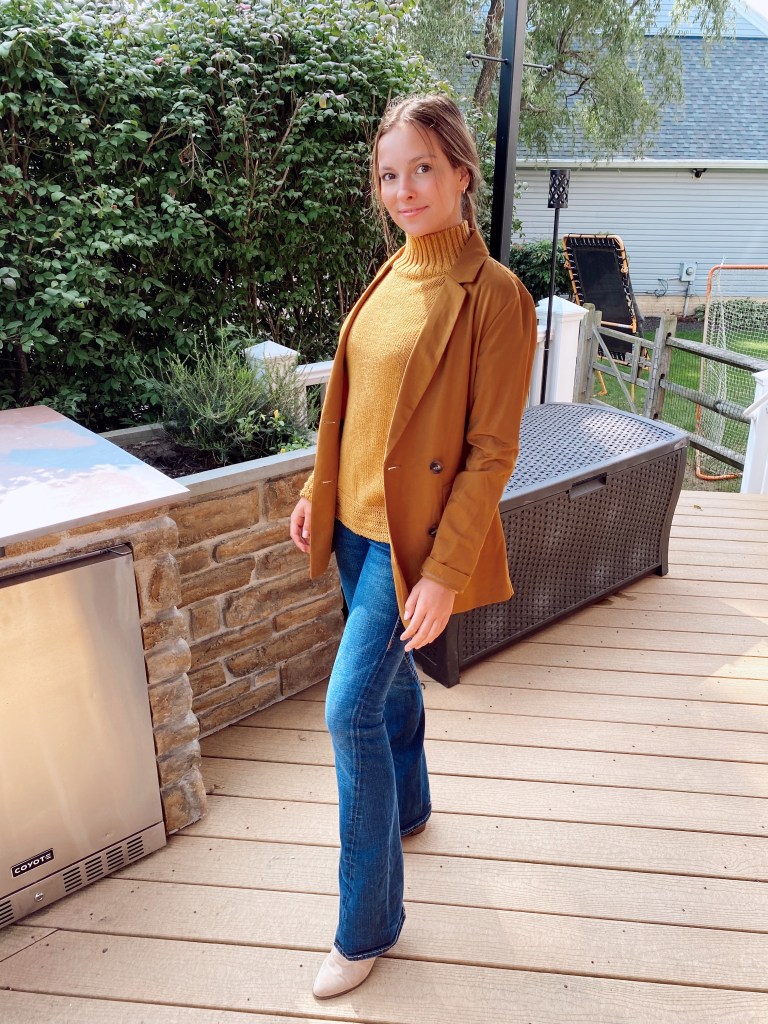 As I’ve mentioned in previous posts, layering with turtlenecks is so easy and takes your outfit from a 6 to a 10. When it gets chillier, some people feel as if they need to hide their outfit under tons of layers and jackets, but instead you should be styling your outfit WITH the coats and layers. In this outfit, I layered a yellow turtleneck with a similar colored blazer.