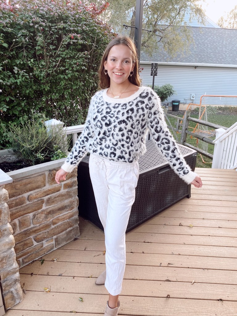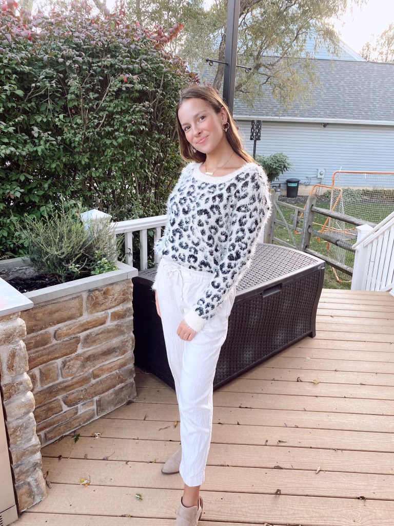 The first sweater I’m showcasing is this adorable leopard print one from Kohl’s that is SO soft. When pairing patterned sweaters you’re 9/10 most likely to grab a pair of jeans to go with it, but honestly if you’re wearing this comfy sweater you might as well wear some loose bottoms to top it off. I paired these cream colored beachy pants that can be worn in summer AND fall and to add that dressy factor, went with some light brown booties to keep the color palette going strong.