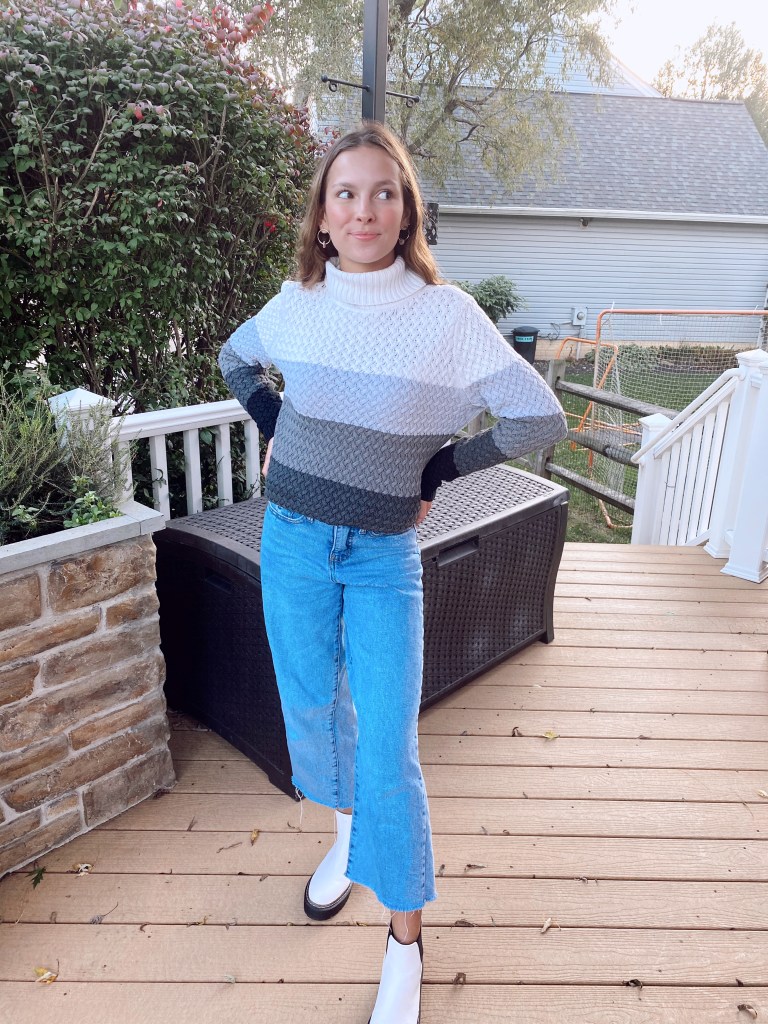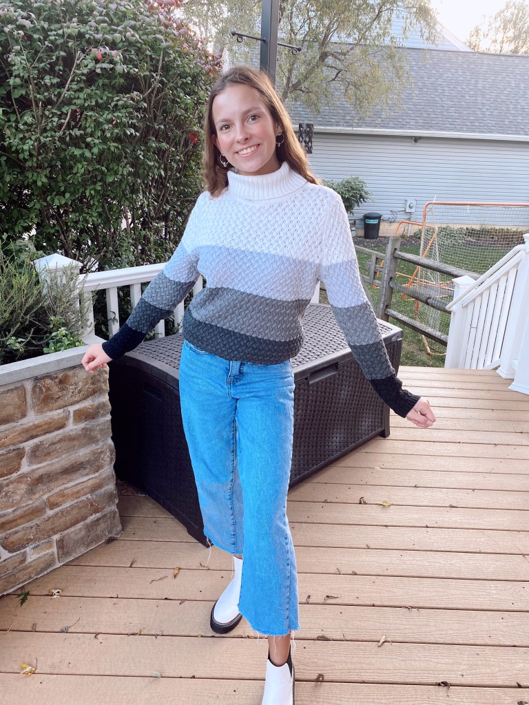 I’m absolutely in love with the ombre stripes in this turtleneck and honestly you could pair it with a variety of bottoms, which is always a plus because who wants to wear something once and never wear it again? Right! Not everyone has the budget for a whole new closet so sweaters that can be worn with many different things and for different occasions are always a yes.