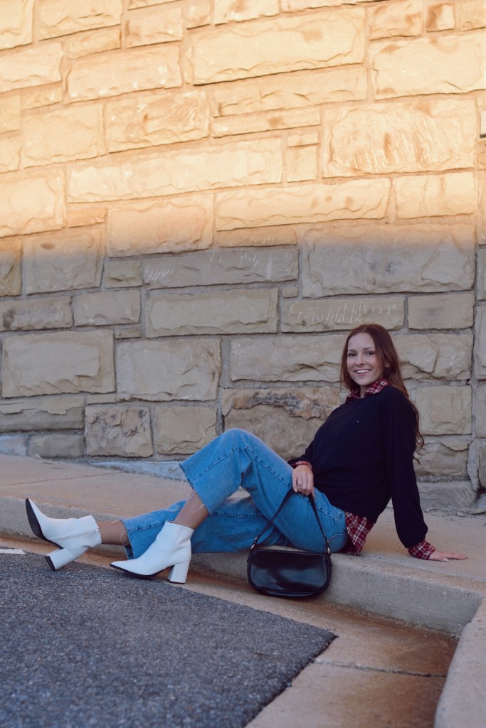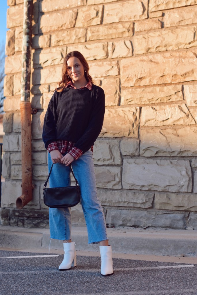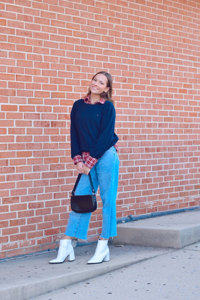 At first glance this outfit may look super cute or super basic (everyone has different taste), but honestly layering any collared shirt underneath a sweater is super in trend for this fall/winter season. All over Pinterest I see people styling their outfits using this layering technique and I love it. I think it adds volume and spice to any boring outfit. I decided to layer a flannel with a light sweater over top and I think this is the perfect fall outfit. However, if it gets colder, layering a chunky sweatshirt overtop all of that will still allow you tasty warm and cute at the same time!