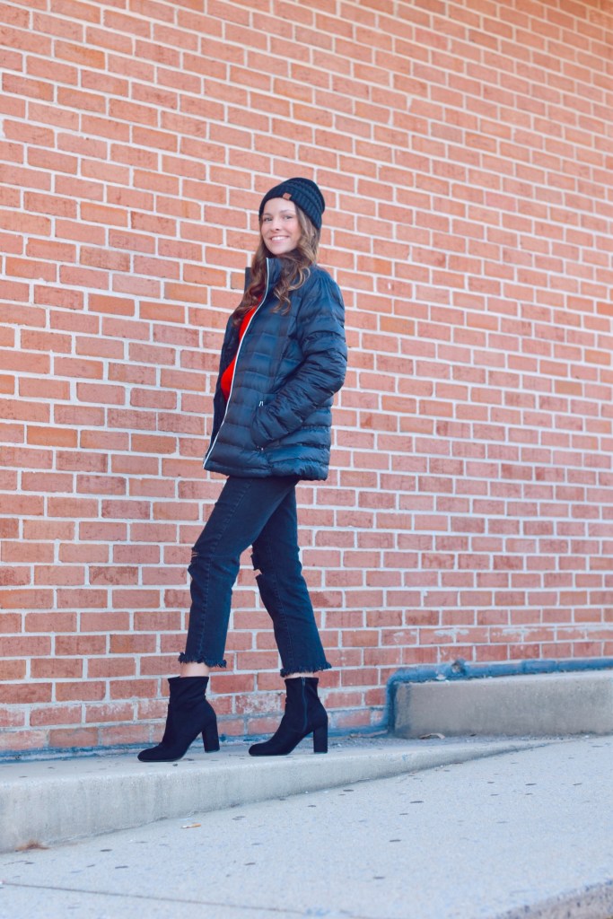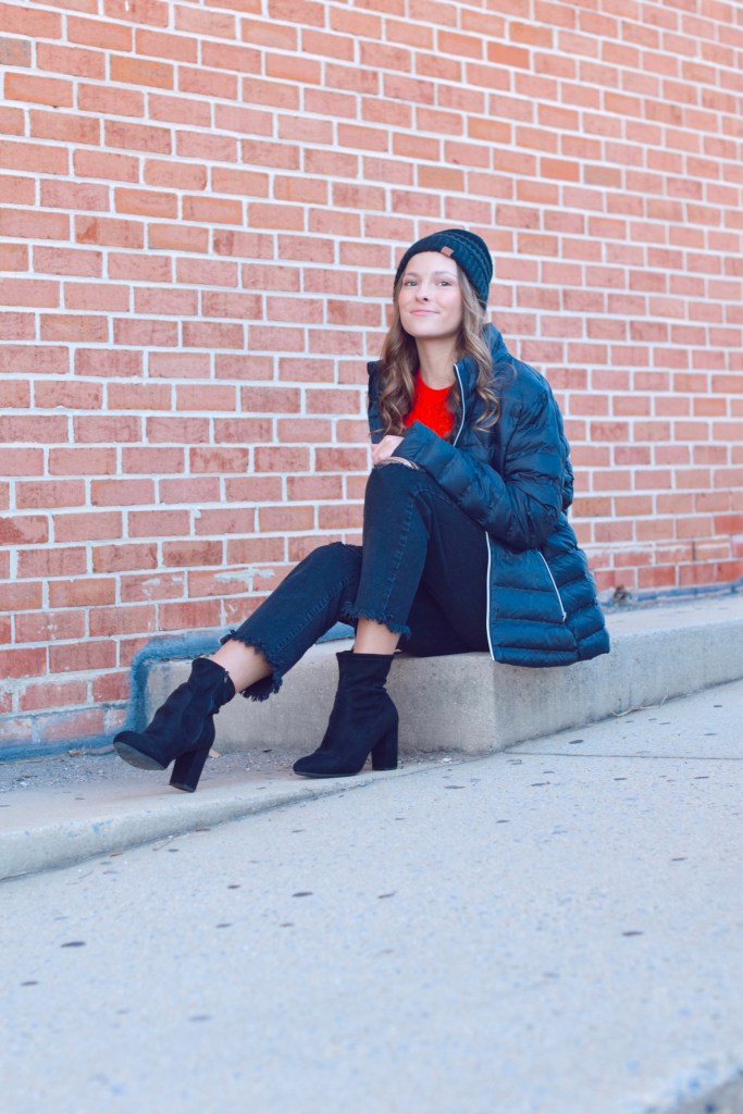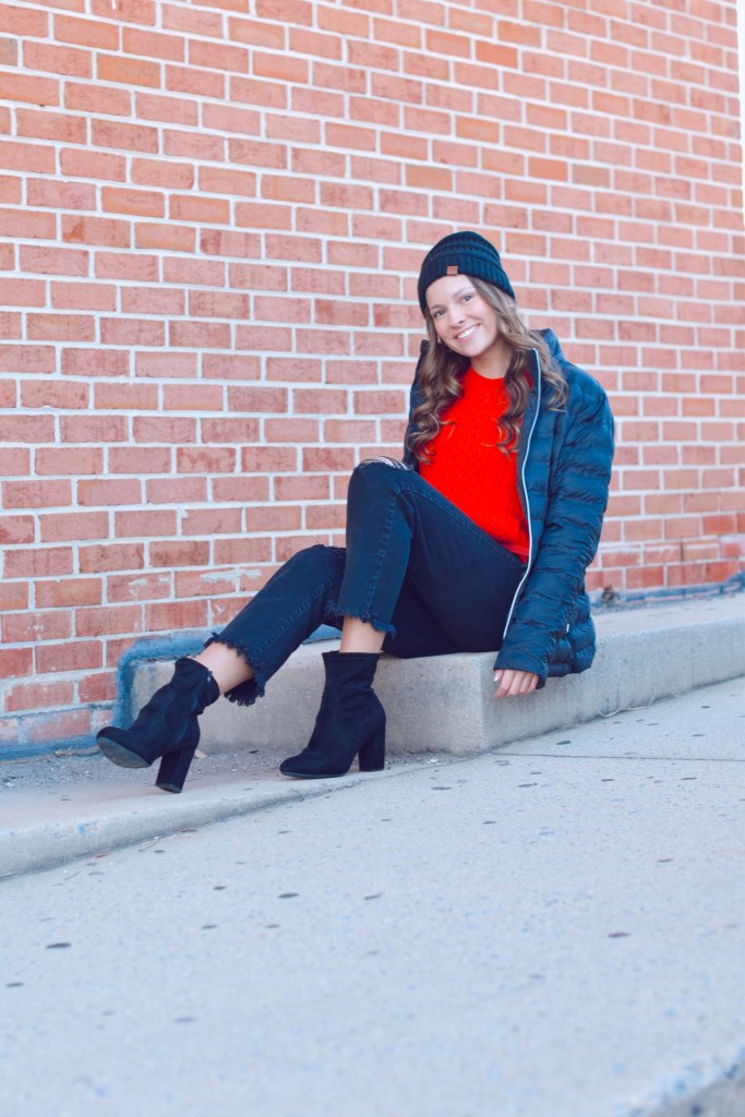 The last look for today’s post is this almost monochrome look (I had to add this pop of red to remind us all that Christmas is around the corner!!). For this outfit, I paired the red sweater with black ripped jeans and the black puffer coat in case it gets chilly. The best part about this look is that you can take off or put on the coat and it will still feel complete (plus you’ll be warm!). I also added a black beanie and finished the look with favorite booties ever.