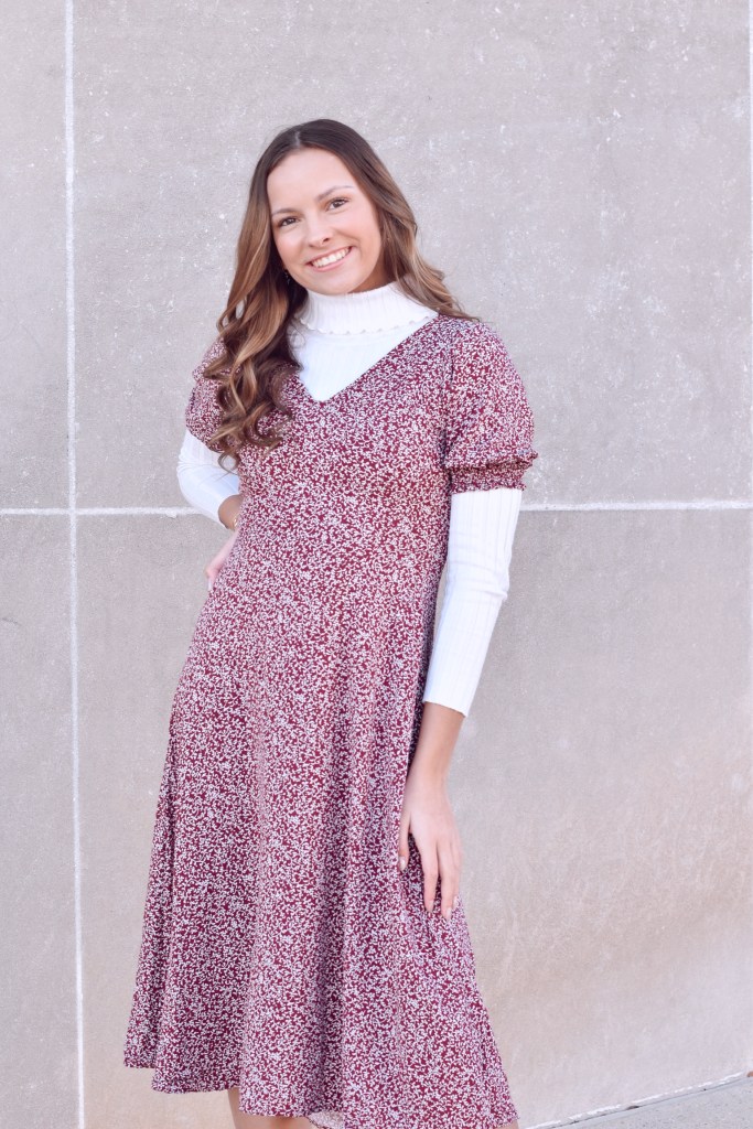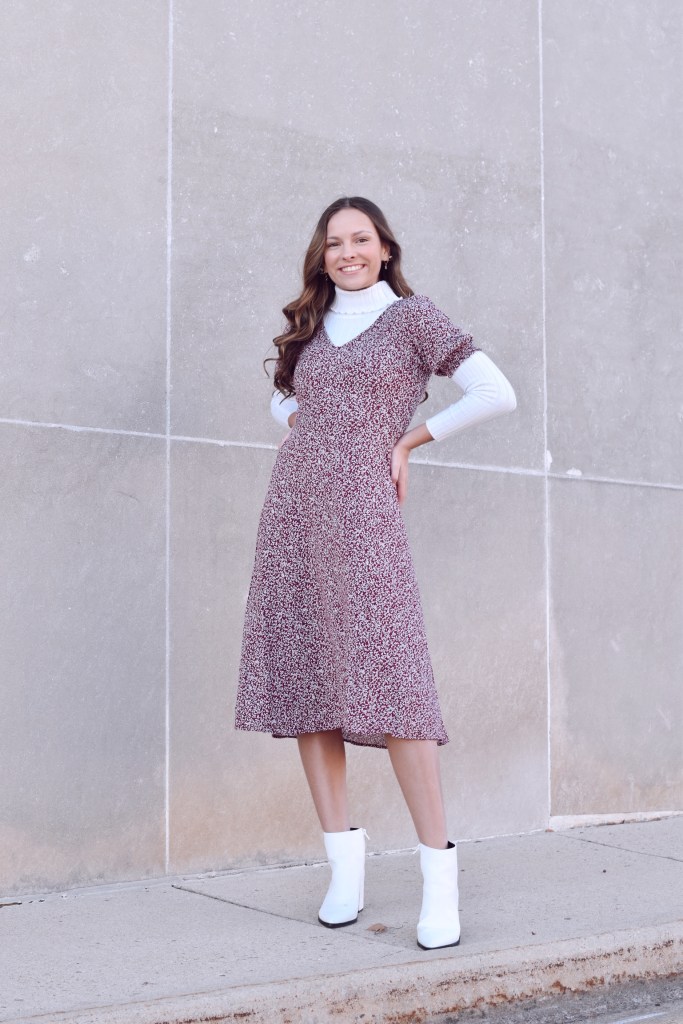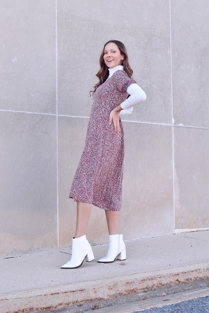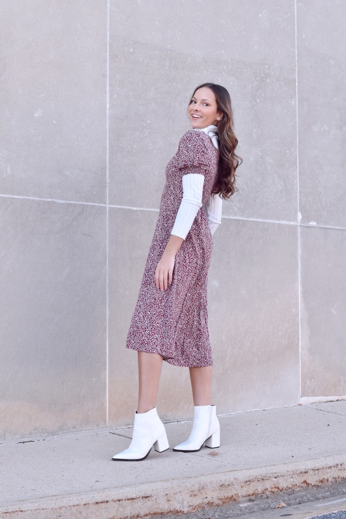 This next look is what I like to call ~improvising~ with your old clothes. Not everyone can get new clothing for each season each year, so it’s all about how well you can re-style clothes. I took this spring/summer type midi dress and layered a white turtle neck underneath. This gave it a fall look and ultimately makes it acceptable to wear during this colder days. Booties are also always a go to for fall/winter looks so I paired these white ones to match with the turtleneck.