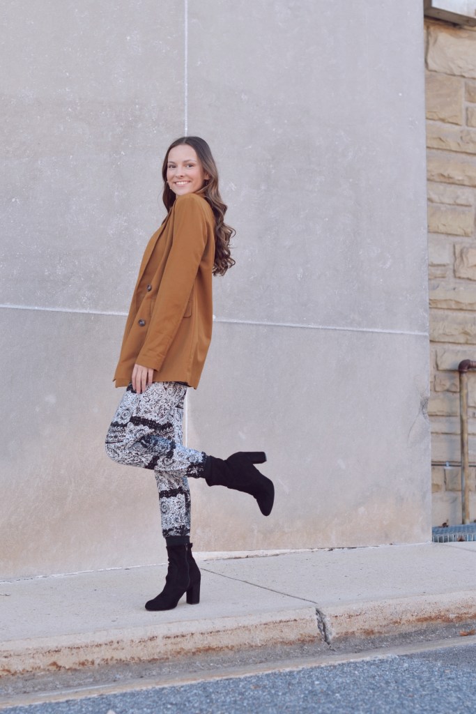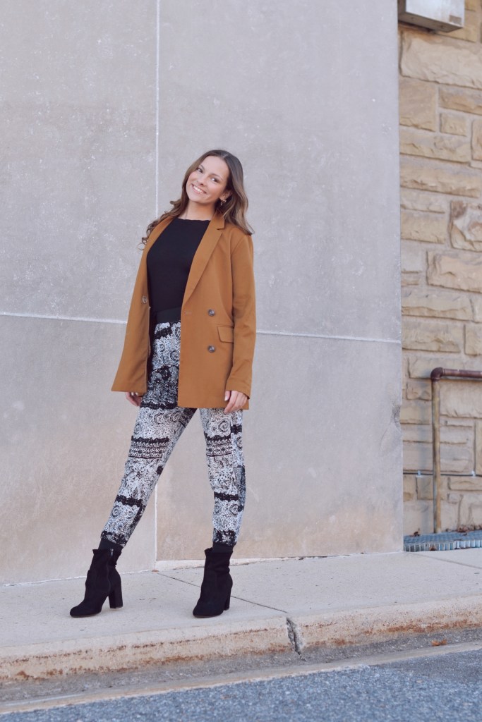 I decided to take two of my newest obsessions and style them in ONE outfit, combining both a blazer and a printed pant. At first, I was little skeptical of this outfit but after looking at it for a bit, it started to grow on me. I think that a wide leg printed pant definitely would look better for this specific outfit but I was using what I had! Overall, I love both a blazer and a printed pant and I can’t wait to keep styling these clothing items.