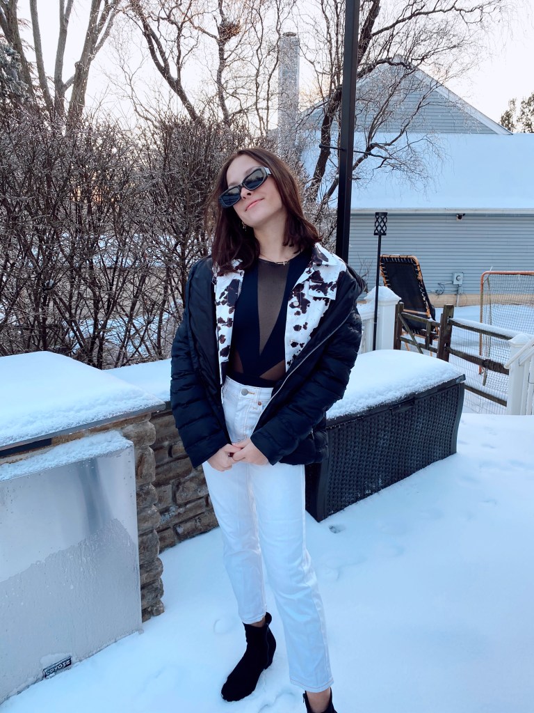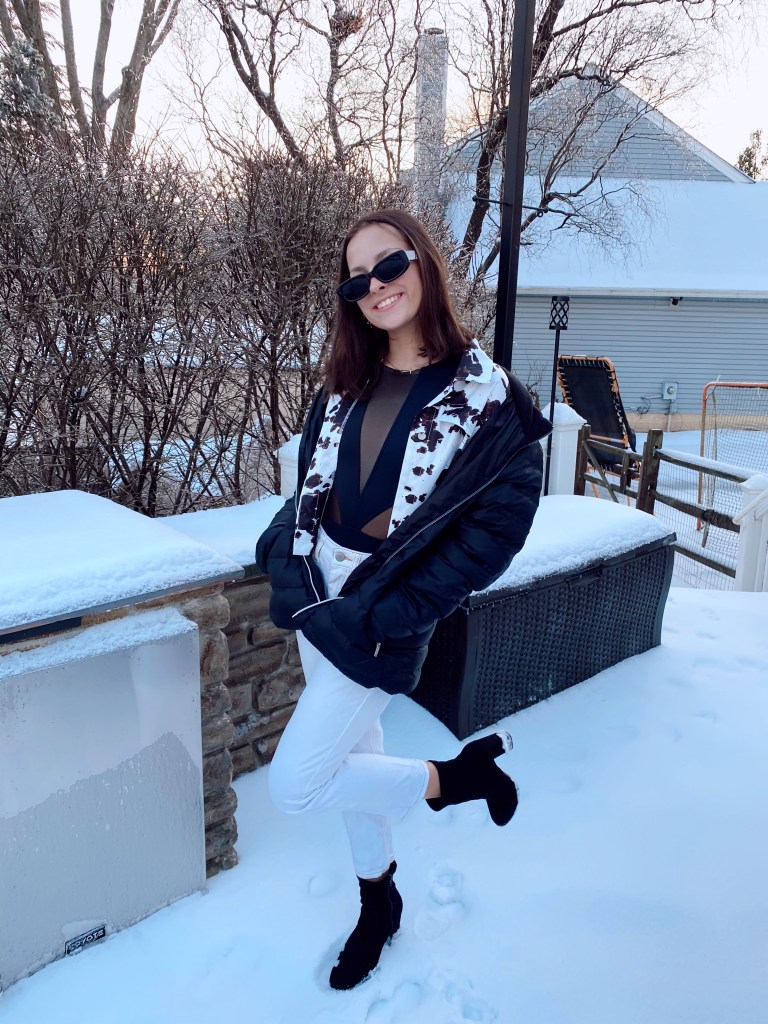 For the first look, I started out with a good base: white jeans and a black bodysuit. I decided to keep the black and white color scheme going by adding this fun cow print jacket. Honestly, if it’s warm where you live you could end the outfit right here, accessorize, add some shoes, and you’re done. However, it snowed in Maryland this week, so it was pretty chilly. I went ahead and added another layer, which was my black puffy coat. With the white cow print in the middle of the black coat and top, the printed jacket stood out which I loved. I finished the look with my black booties and sunglasses.