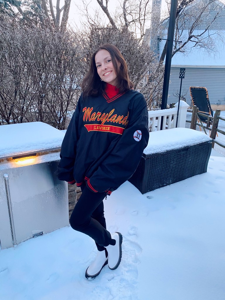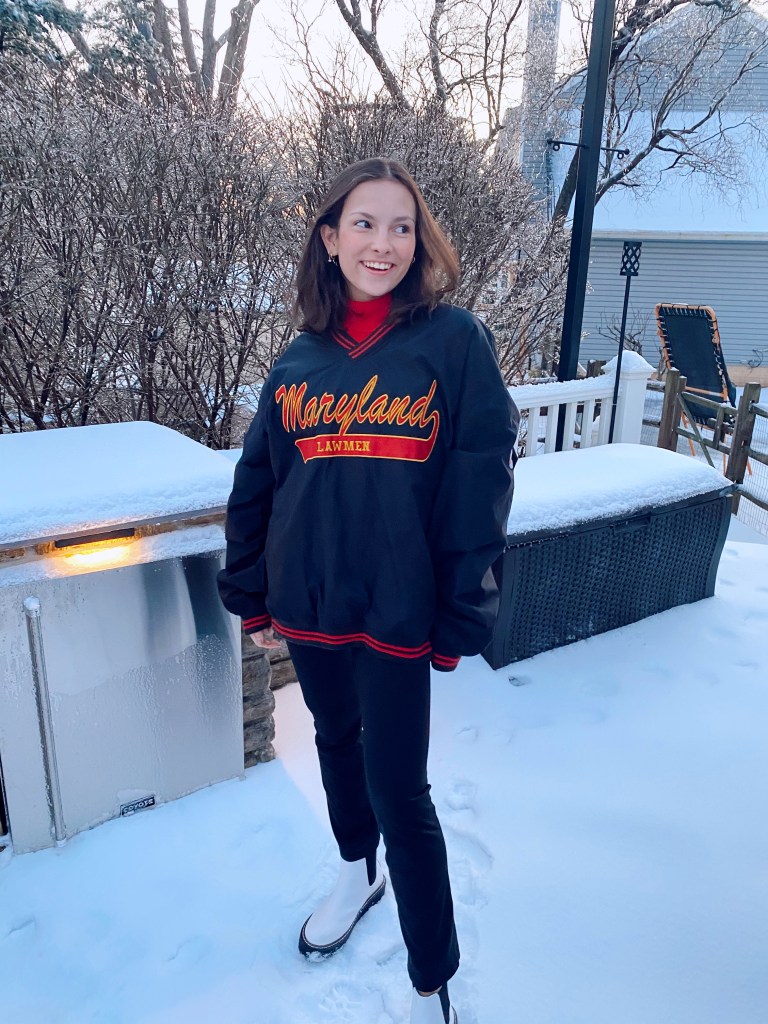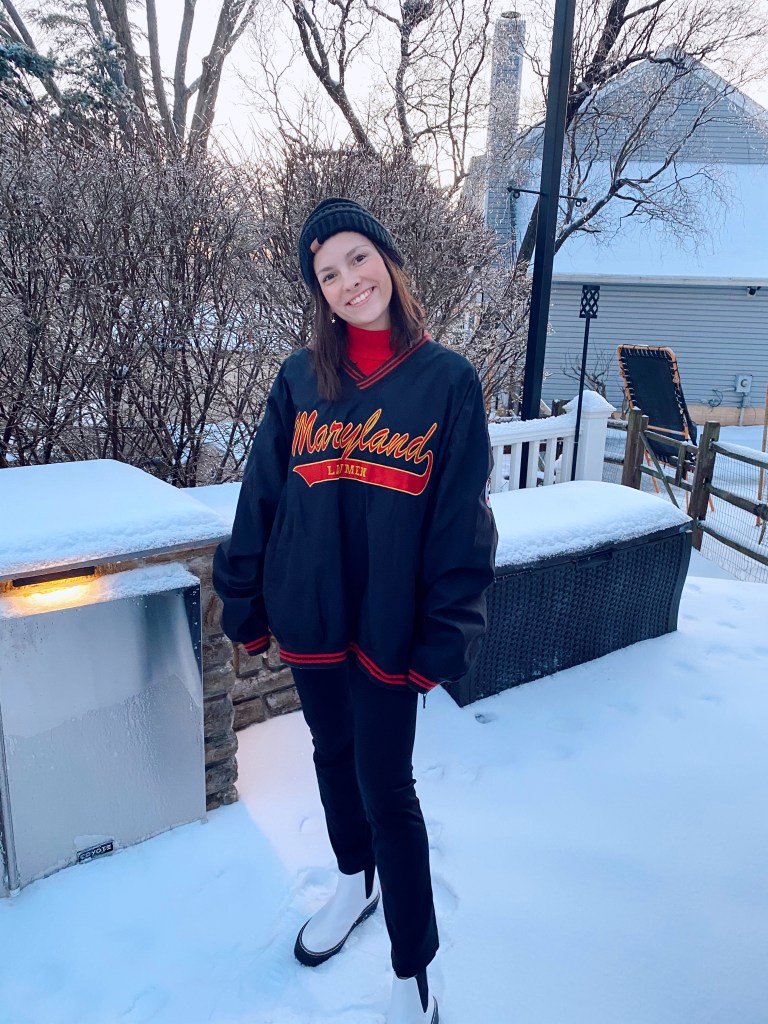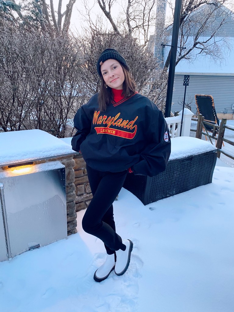 For the next look, my base consisted of black yoga pants and a red turtleneck. Turtlenecks are by far the easiest article of clothing to layer and they always turn out super cute. I added this big Maryland windbreaker type coat overtop. Shoutout to my dad, found this in his closet lol! This outfit kept me super warm and it was so effortlessly cute. If I were in school, this would definitely be something I would throw on for that. To accessorize, I added a black beanie and for shoes I put on my docs.
