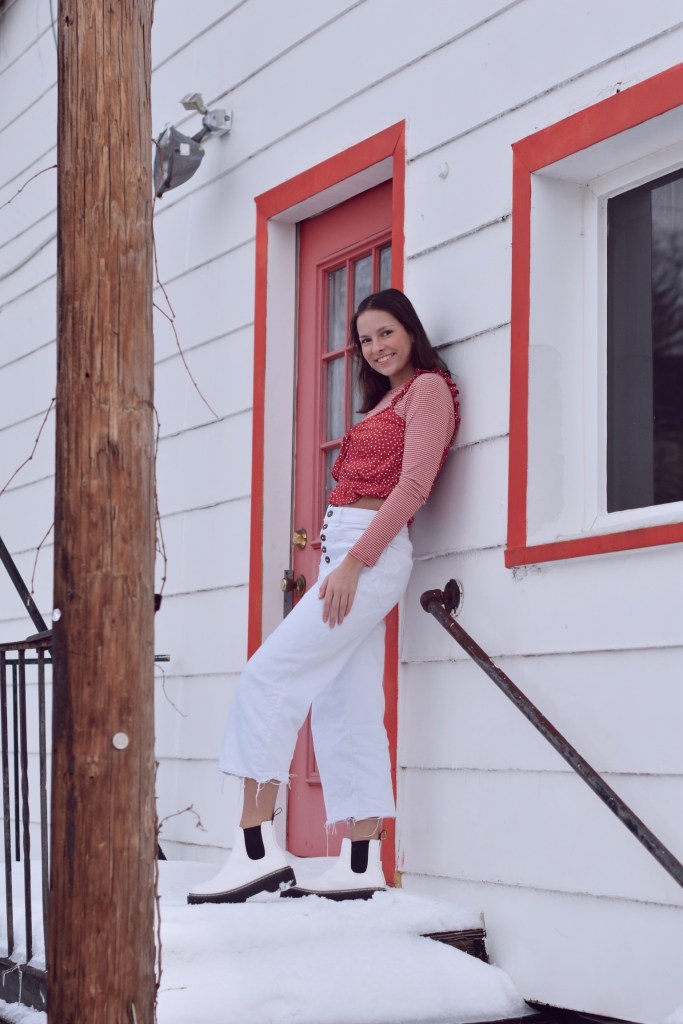 Mixing patterns used to be something I thought was the complete opposite of “fashionable”. I only really saw it on runways from expensive fashion brands, but I realized it’s all about what YOU feel fashionable in. I think mixing patterns is such a fun way to experiment with fashion and that’s what I did here, nothing too overboard but still a different look. I paired basic white wide pant jeans with a striped red and white tank with a polka dot top layered over top. Overall, I think this outfit ended up mixing the two patterns pretty well, it’s not too overwhelming.