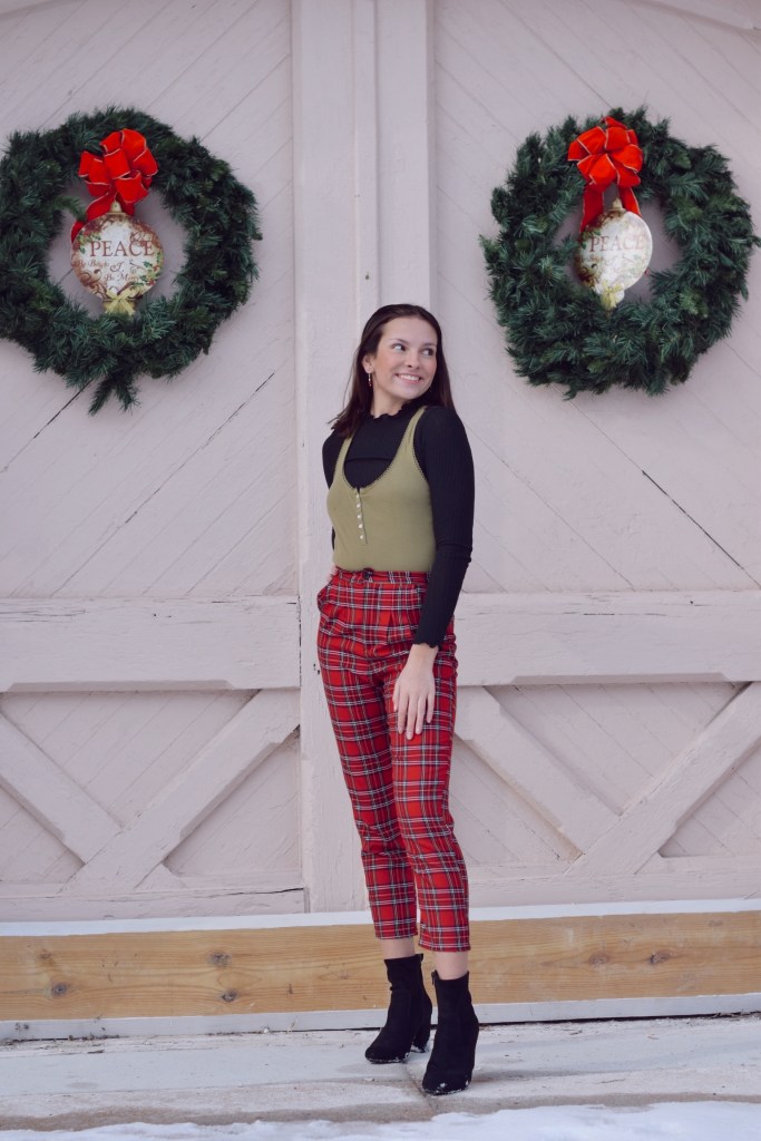 I’ve been obsessed with these plaid pants for awhile, so I just had to create a look with them. Green goes very well with red, especially this sage green tank I paired with the plaid pants. Due to the chilly weather, I had to layer a black mock neck underneath but it ended up working out because they matched with my go to black booties! I love how all the colors in this look complimented each other.