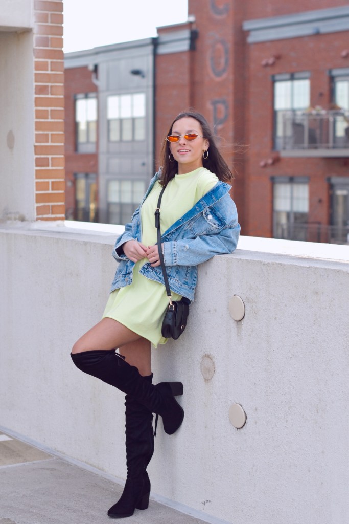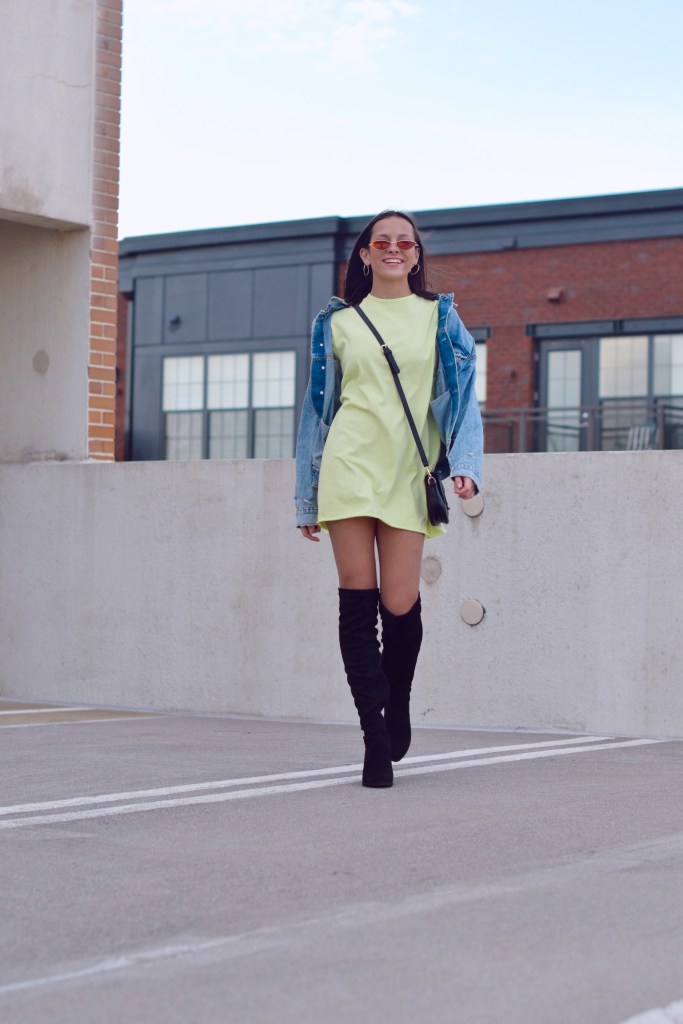 I based this first look off of this neon green t-shirt dress that I had no idea had to style. Honestly I thought I left t-shirt dresses back in 2016 when I wore them in middle school. Though when I tried styling it a little differently I was obsessed. Now, these knee high boots are something I was never brave enough to try, but this year I wanted to give them a go. They’re a bit difficult to style to be completely honest. I never really liked the way they paired with denim, but skirts/dresses go very well with these babies. However, a denim jacket ended up looking so good with this look. I liked the oversized, distressed kind of jacket which obviously enchanted that “edgy” style I was going for. I finished the outfit with a black cross body bag and some tiny sunglasses.