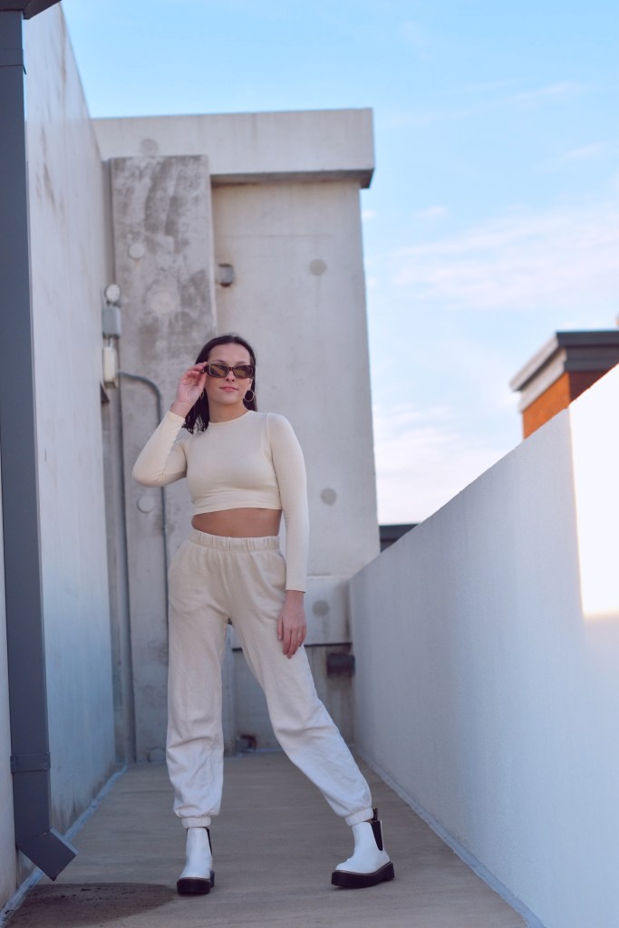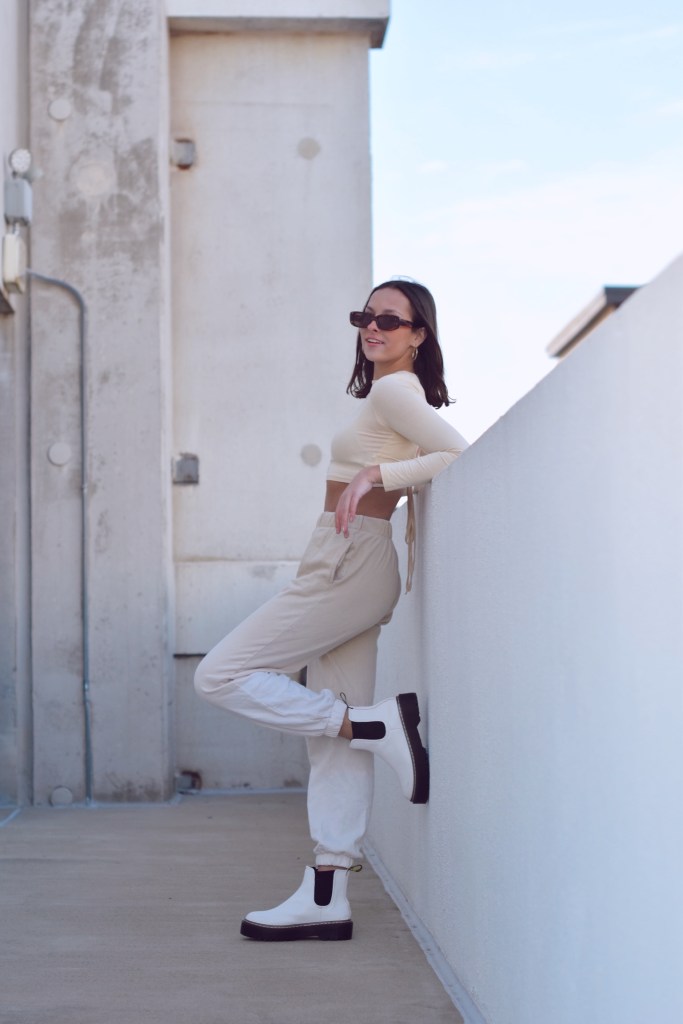 To finish today’s blog post, I wanted to add a more casual look. This isn’t a matching sweat set, although those are very much fashionable at the moment. I actually paired these ombre colored sweatpants and a cropped long sleeve top that matched. I love how simple the clothes are yet they give off such a chic, edgy vibe. For shoes, my docs seemed appropriate and my brown rectangle sunglasses completed the look.