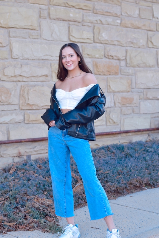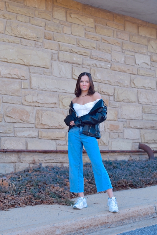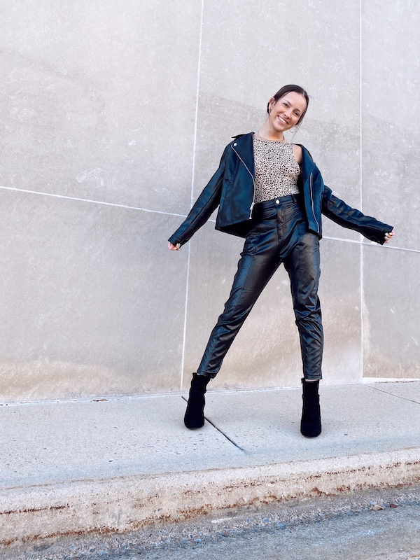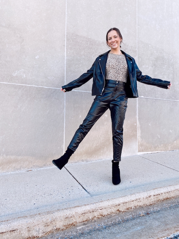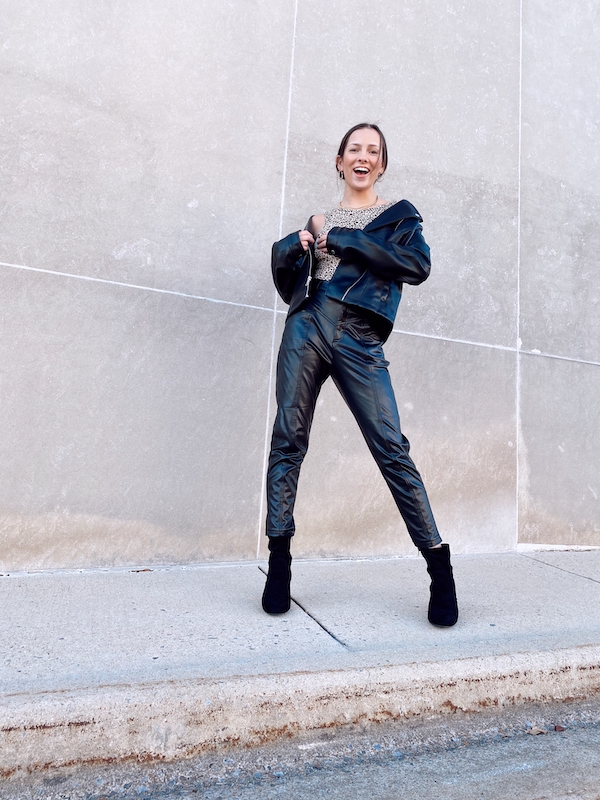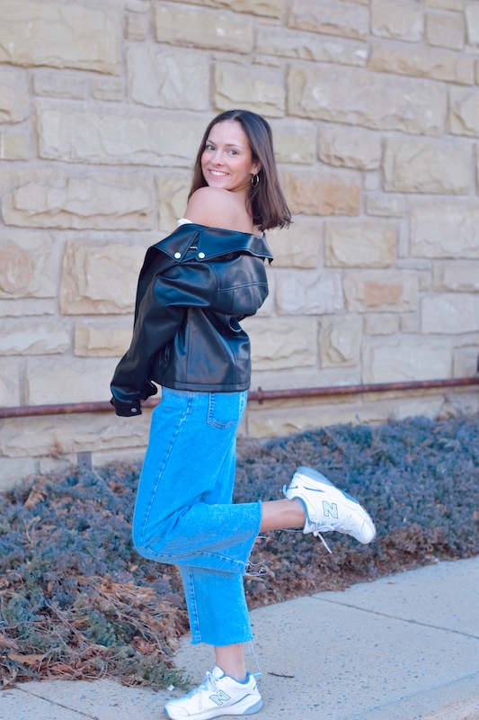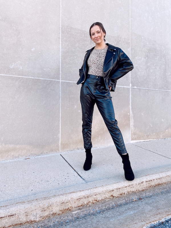 Honestly with this look, any jacket works, I just chose the leather because I wanted to test the waters. A denim jacket, shacket, or blazer would work just as well. If you’re trying out a more edgy style this year, I’d highly suggest investing in a leather jacket. With this look, you’re not completely shattering any fashion boundaries, but you’re trying something new!
