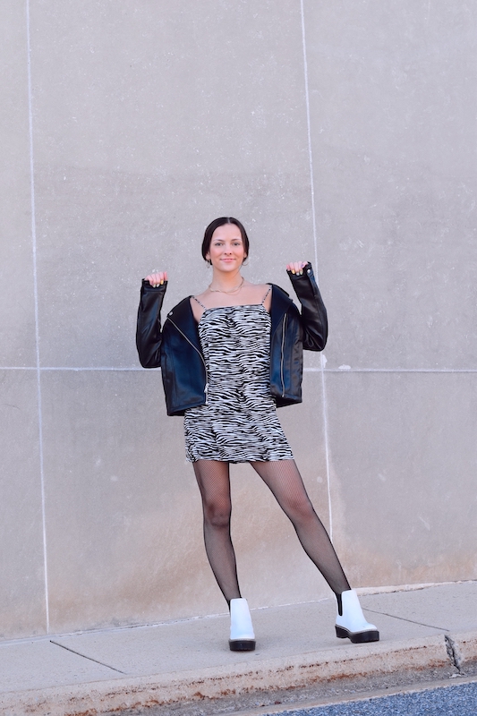 The jacket is one thing, but honestly, my eyes are completely focused on the fishnets. No seriously, at this rate, I’m going to be writing a full post on how to incorporate fishnets into your looks. Obviously, this blog post is about leather jackets so let’s chat. I wanted to do a look with a dress and right off the bat, I knew this zebra dress would look so good with the jacket. I went with docs for shoes in order to keep the black and white color palette going.