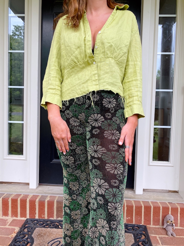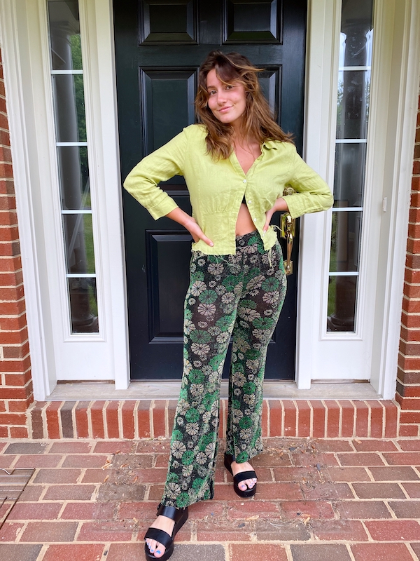 For the next look, I started with the pants. Like I mentioned, lots of statement pieces in Andrea’s closet (no complaints here!) I loved the style and color of the pants but I didn’t know what top to pair with them…until I found this lime green button up. I really think Andrea was setting me up for success because everything was going together so smoothly. Although the green in the top and the bottoms were different, it was like two puzzle pieces that just ended up matching together perfectly.