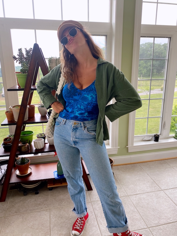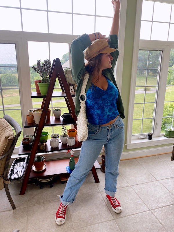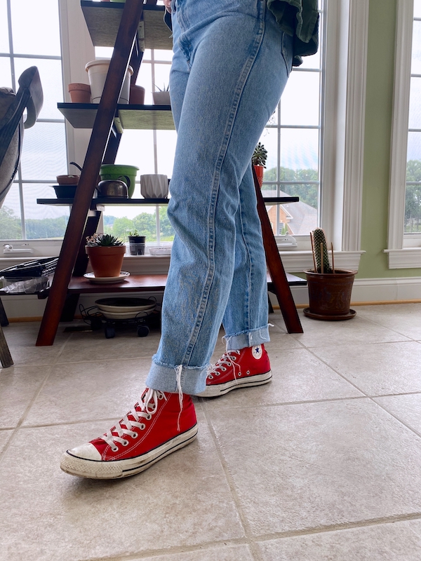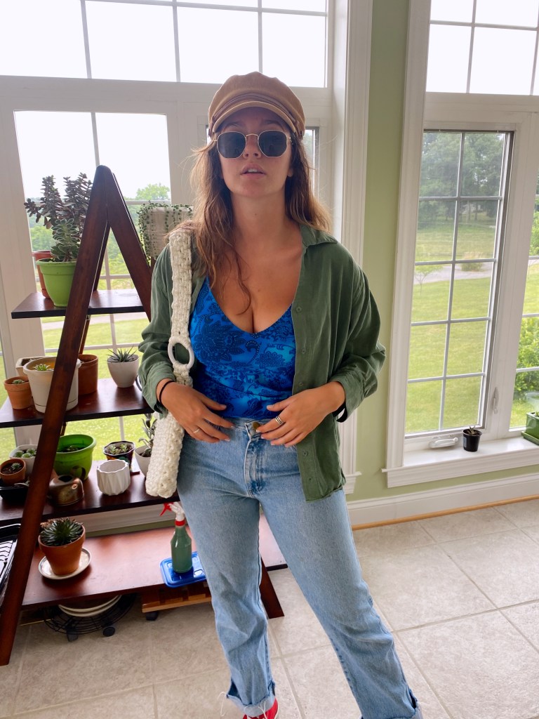 Although we were on a roll with the more unique outfits, Andrea told me this look was the most “her”, and I wholeheartedly agree. She said this was the look she would probably wear out the most often which makes sense as it’s the most casual. However, I still wanted to make sure it wasn’t boring (because one can be both casual and colorful). I started with this really interesting bright blue top Andrea had trouble styling. I then grabbed a pair of denim jeans and went from there. To add some different colors I went with this moss green button-up and threw it over top, along with some bright red converse for shoes.