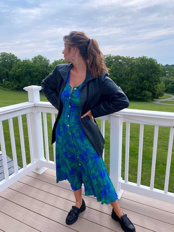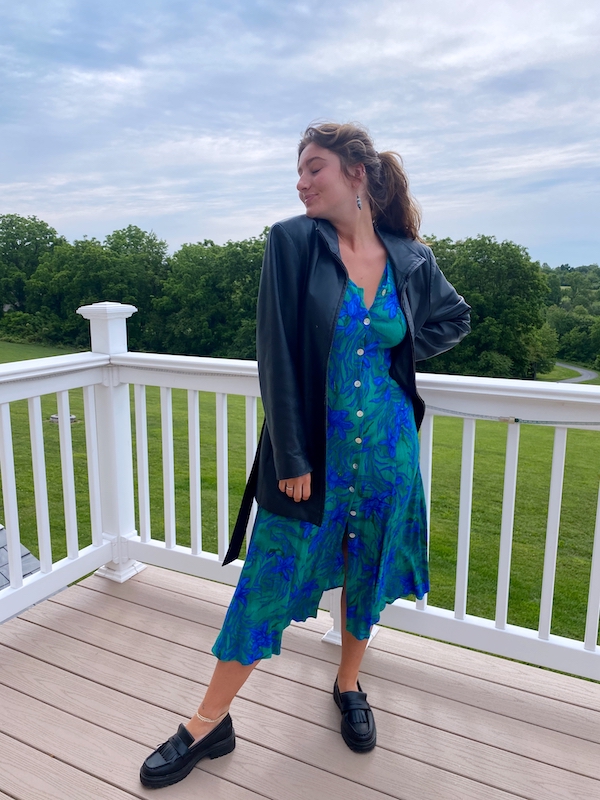 Since shoes were being highlighted as well, I wasn’t sure which shoe to go with. Since it is summer, I thought about going for an open-toed shoe….but then my eyes landed on these incredible chunky leather loafers. Without a jacket, I wasn’t sure if the look was going to come together with just being the dress and shoes. So, as I was looking around for some sort of black jacket to complement the shoes, Andrea handed me an oversized leather jacket. Seriously, the leather and the summery dress were like a match made in heaven. When Andrea put on the entire look my jaw dropped, I seriously would have never considered adding leather to such a colorful summer dress. I loved it.