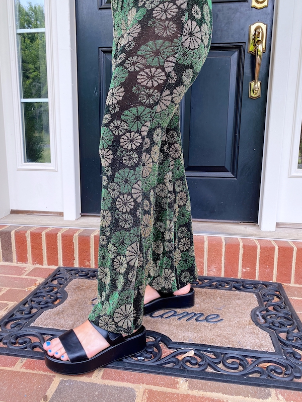 As for shoes, I wanted to try an open-toe for this look, and my eyes gravitated towards these chunky black sandals. Honestly, you’re probably thinking to yourself that these looks are so out there that you wouldn’t know where to wear them. For this one, I actually can see it being a beach look (possibly a cover-up or dinner outfit?) I mean think about it, the flared pants are perfect for the beach. You could just wear the bikini top and go or throw on the button-up if it’s windy! Anyways, that’s just my two cents on why you can always wear the out-of-the-box outfit. Thank you for your time.
