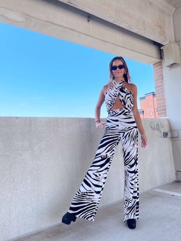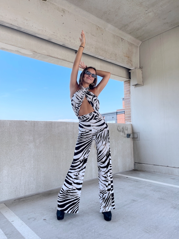 Dresses are something we all gravitate towards when choosing a going-out look. However, I tried to spice it up a bit with a jumpsuit. This particular jumpsuit not only had a fun pattern but a neckline that was super on-trend. I added black heeled boots to give me some height and a pair of brown square sunglasses to appeal to the colors in the outfit. I love outfits that accentuate my legs, and the jumpsuit/heeled booties combo definitely did that.