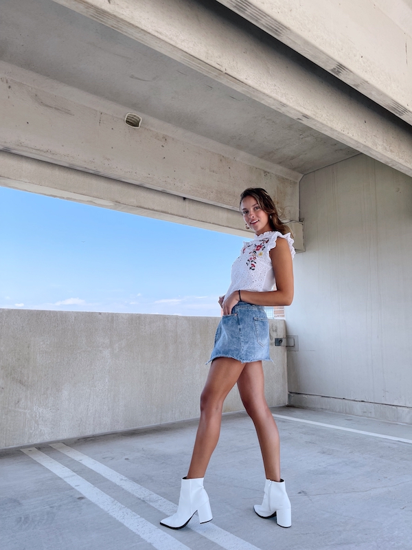 Again, I chose pieces that make my legs look longer, which is why I finished the look with white heeled boots that also matched with the white top (again, color coordination is key).