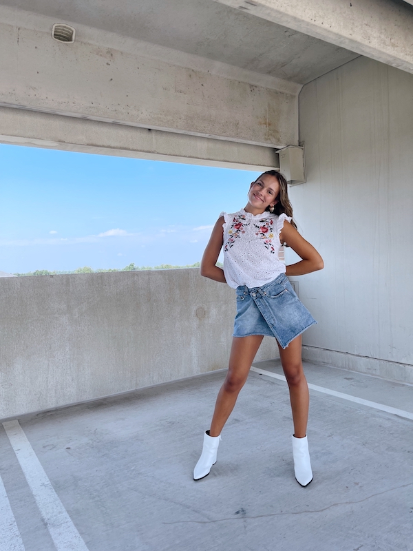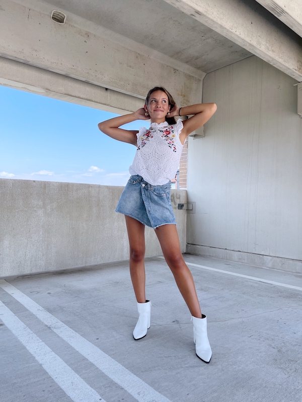 For the last look, I wanted to add a bit of color and some denim to relax the outfit a bit. For the top, I’m wearing this floral embroidered shirt with a mock neck. As for bottoms, this unusual denim skirt. I like that both pieces seem plain to the eye but they’re actually more interesting up close. The top has embroidery and the skirt almost looks like a pair of shorts that have different lengths.