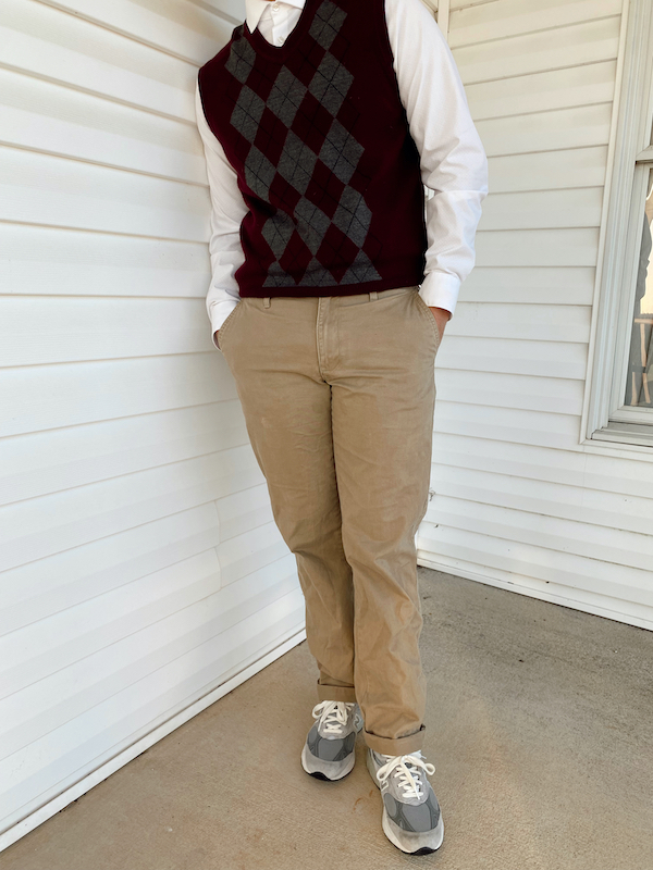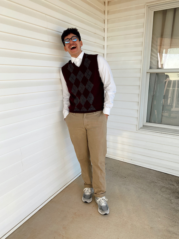 The last look of today’s blog post is Mav’s solo outfit. He wanted to style this sweater vest, so I layered it over a white button down and paired it with the brown pants. To keep it casual, I had him wear these super cool gray New Balance sneakers.