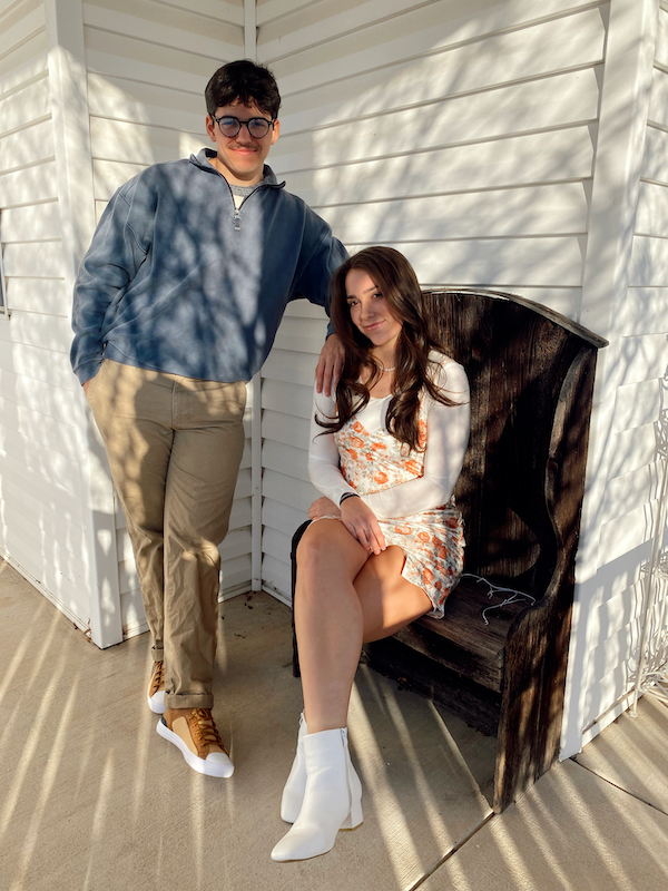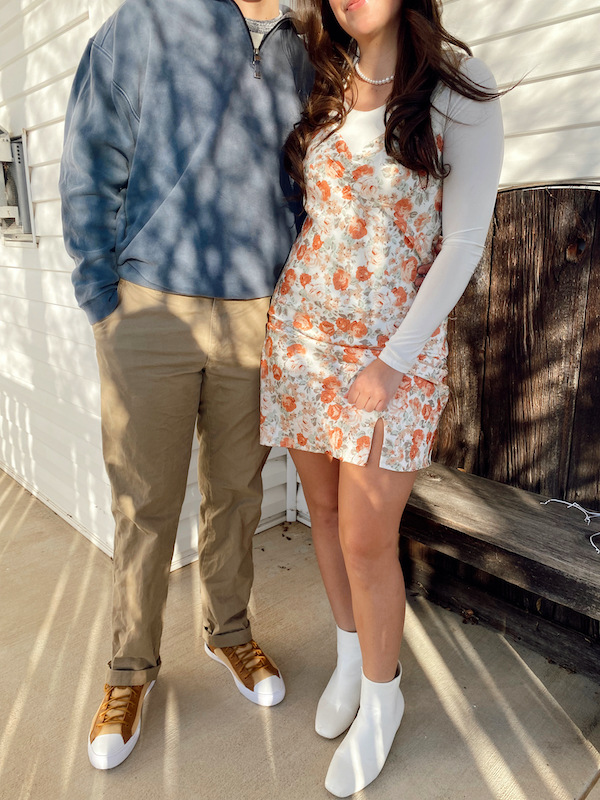 This next look is very floral and spring like, but classy nonetheless. For Mav, I really wanted him to wear this sweater but he wasn’t a huge fan, so I had him wear a quarter zip over top. He’s wearing the same pants as the last look, but going for a more casual shoe choice. These brown converse were absolutely awesome, and I definitely wanted to include them. Mara is wearing a very spring-y dress, but all she had to do was layer a white long-sleeve underneath to make it more appropriate for the weather. Her look is finished with white booties, and overall I love these two looks (separate and together).