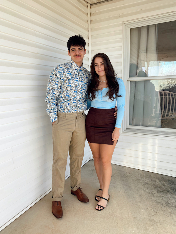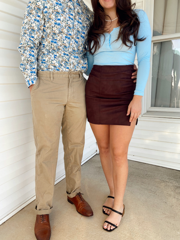 Obviously my goal with these looks was to have the two of them match in a subtle, satisfying way. I started with this blue floral button up of Maverick’s, I knew I had to use it for a look. I paired it with brown pants and dress shoes. For Mara, I picked the blue bodysuit and brown skirt to go with the blue and brown in Mav’s outfit. I liked that the blues and browns in her look were different than what was in his, so the matching was subtle but they still looked cohesive.
