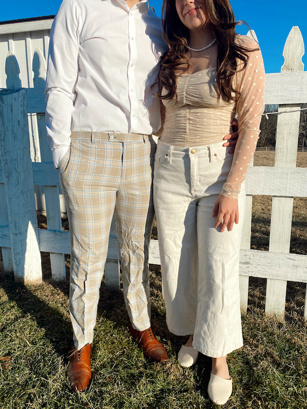 I absolutely adore the colors and patterns in this look. Although Mara is in pants rather than a skirt/dress, she still looks so elegant and classy, perfect for a nice dinner date. Maverick is wearing these fun striped dress pants and a white button down to pair with it. Mara has tan pants and an adorable baby pink polka dot top. Again, the similar colors have the two of them looking cohesive but not “matchy-matchy” if you get what I’m saying.
